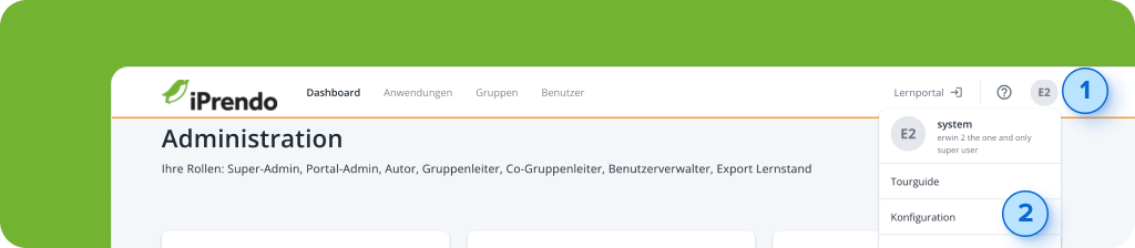 Um Ankündigungen in iPrendo einzupflegen, navigieren Sie in der Administration über das User-Drop-Down-Menü (1) in den Bereich Konfiguration (2).