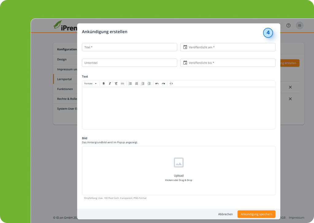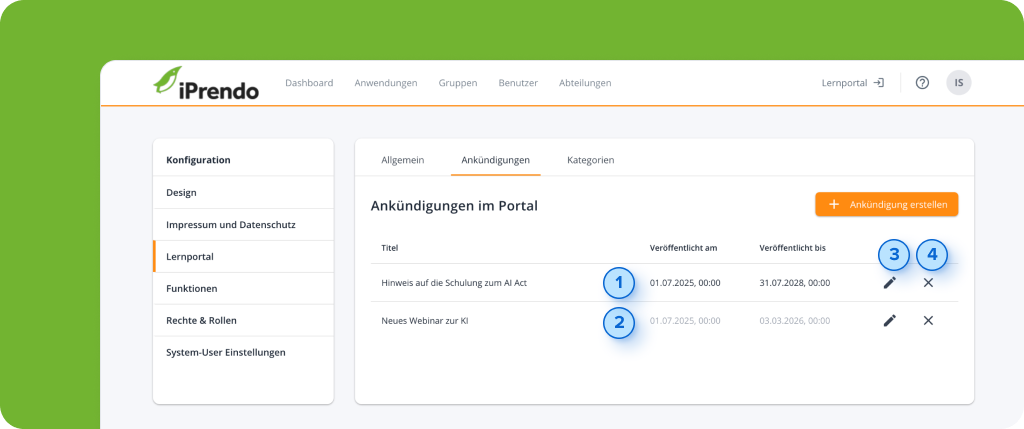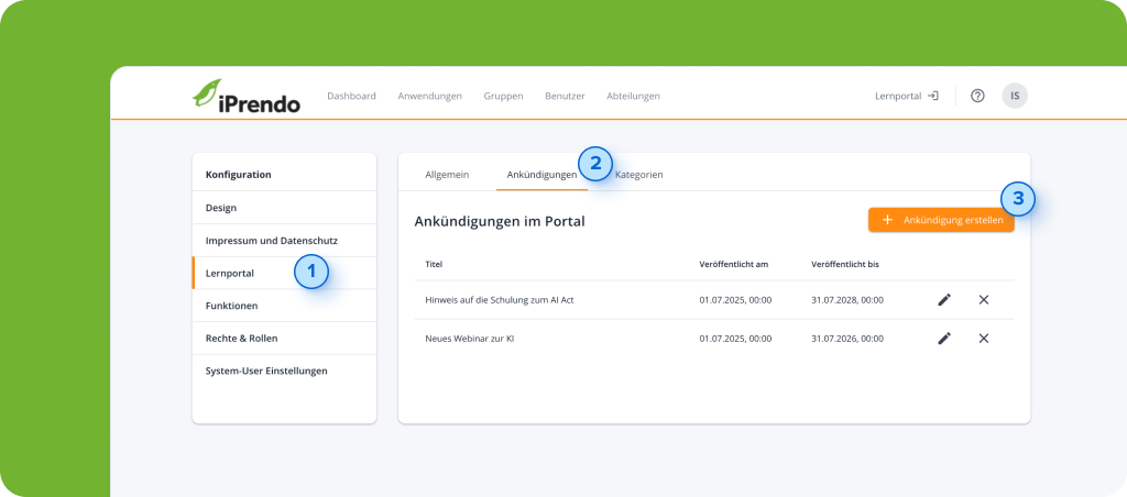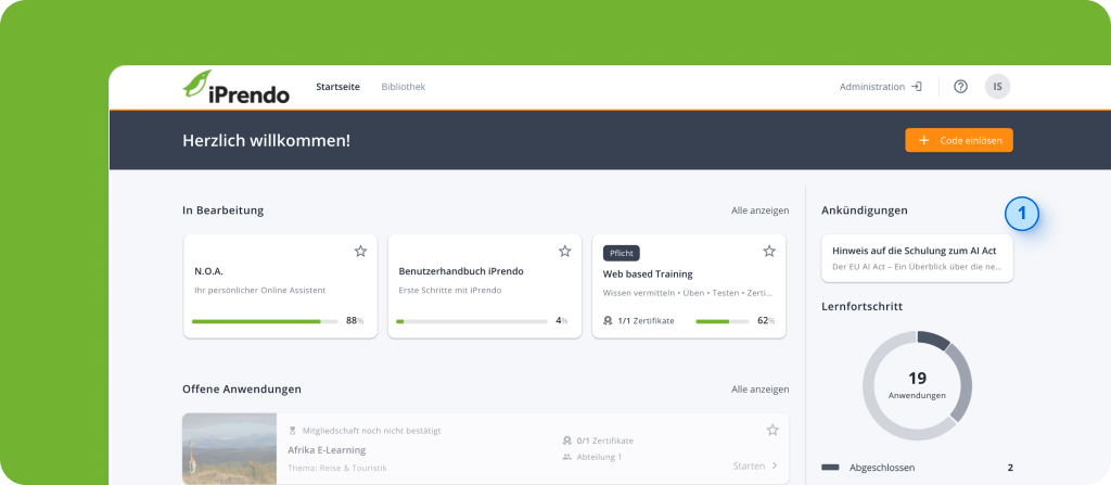 Mit iPrendo-Ankündigungen halten Sie Ihre Nutzenden stets auf dem Laufenden – direkt auf der Startseite Ihres Lernportals. In diesem Artikel zeigen wir Ihnen Schritt für Schritt, wie Sie die Funktion aktivieren und Ankündigungen gezielt anlegen und veröffentlichen. So stellen Sie sicher, dass wichtige Informationen genau dort ankommen, wo sie relevant sind.